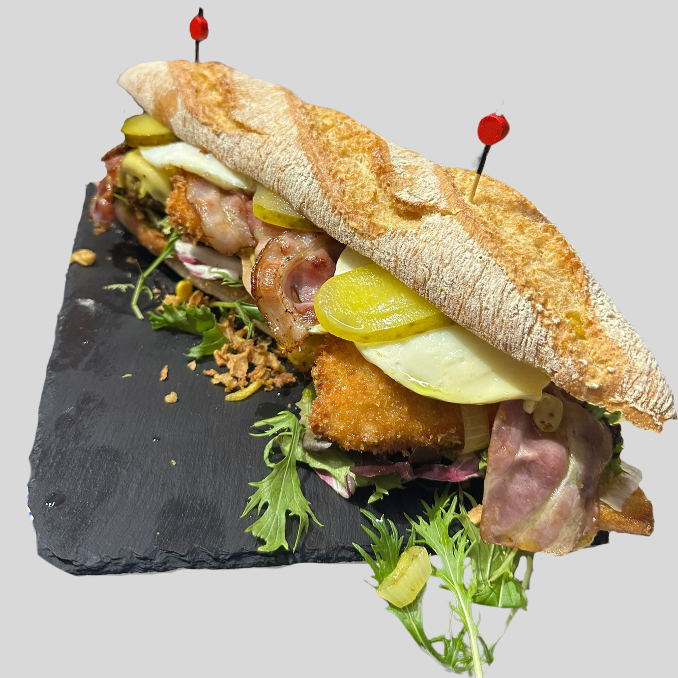 pan baguette - doble carne - doble pechuga de pollo - pepperoni - queso mozzarella - queso cheddar - doble jamon york - bacon tocino - doble huevo - salchicha - pepinillos - cebolla crujiente - lechuga - tomate - cebolla - maiz - patata paja y crema de queso.