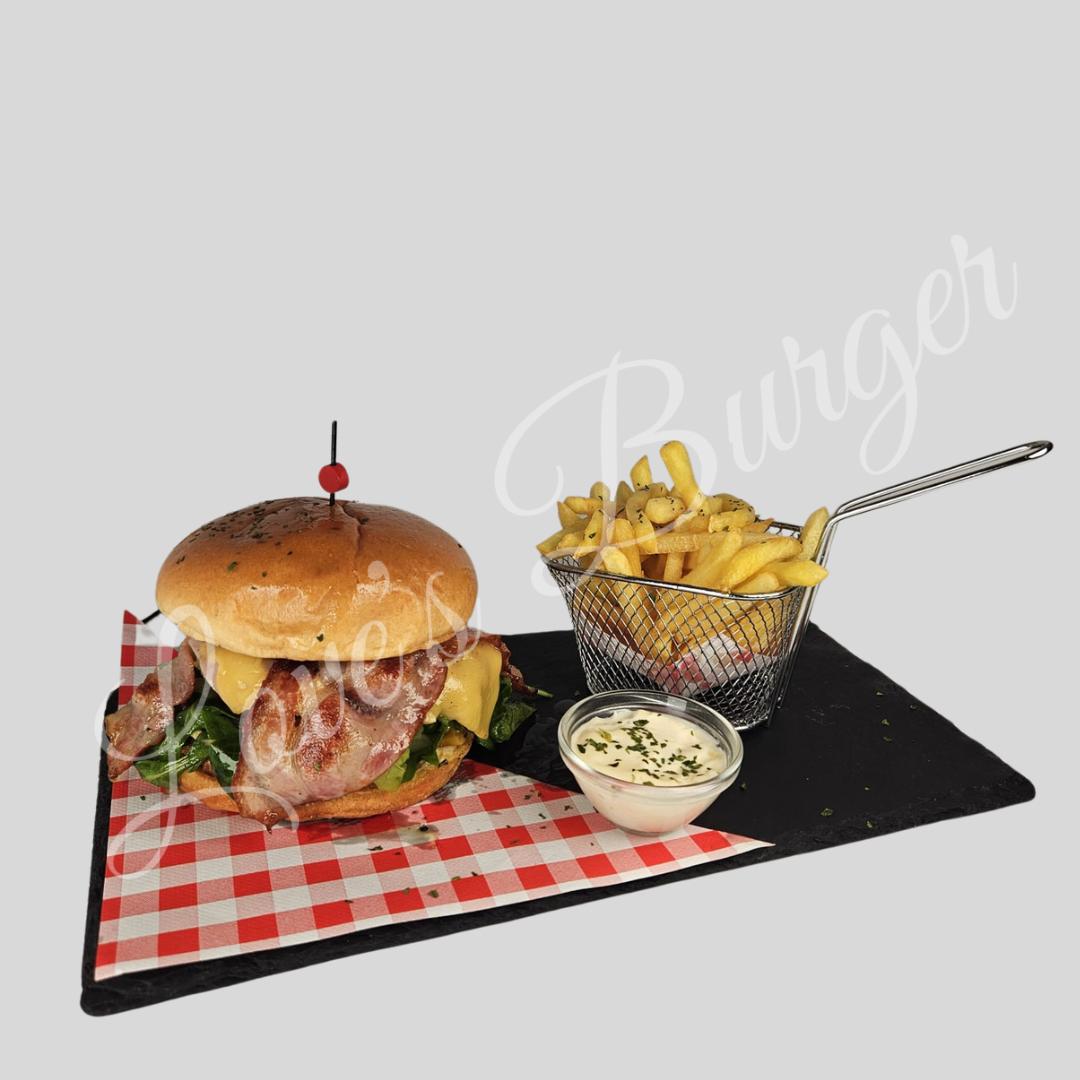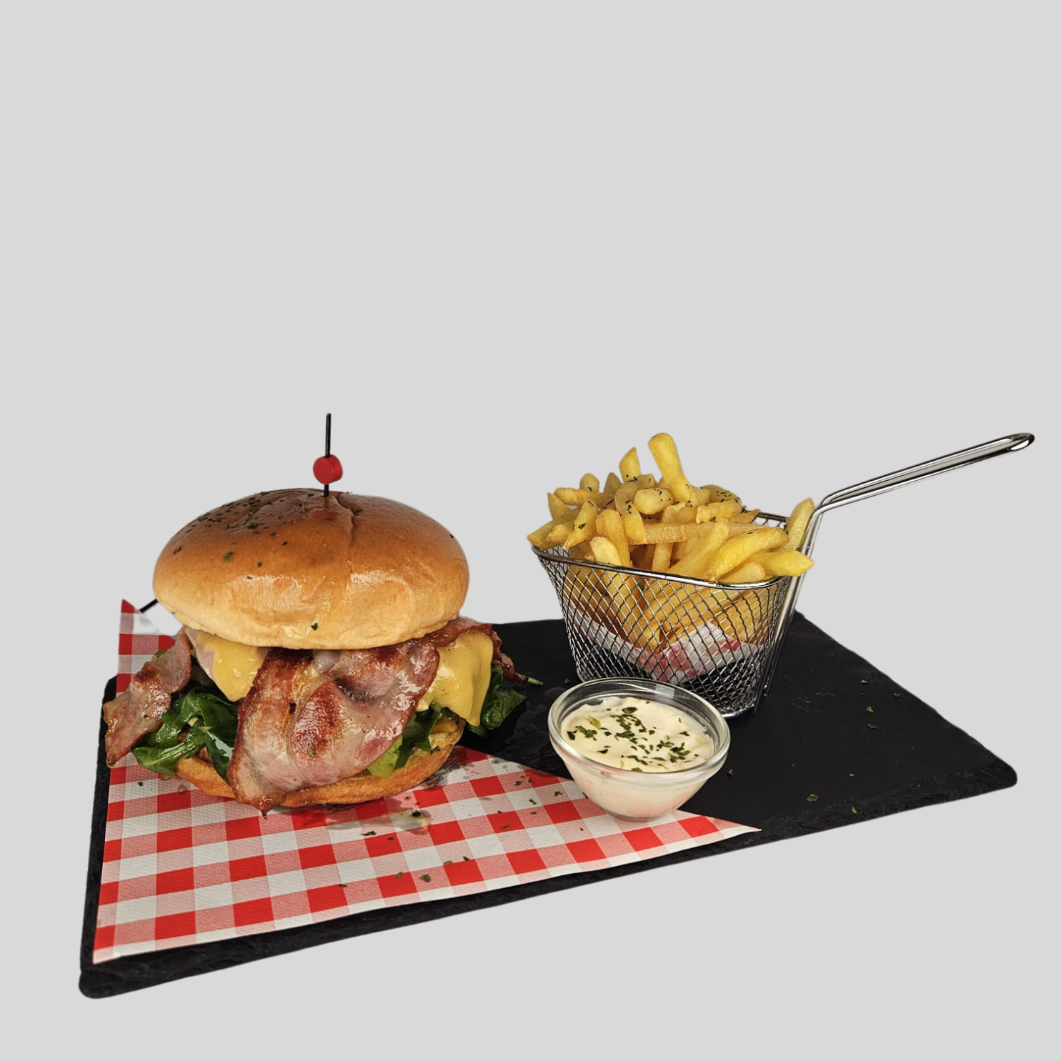 Pan brioche - Hamburguesa 100% Carnes Selecionas - Bacon - Cebolla - Jamón York Queso - Lechuga - Tomate - Maíz - Crema de Queso - Patatas Paja .