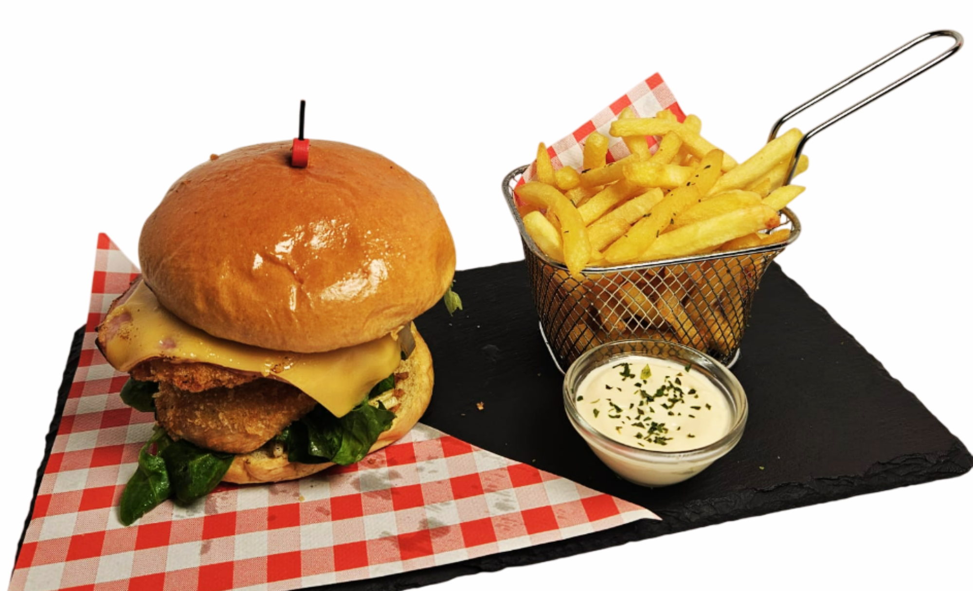 Pan brioche - Hamburguesa 100% Carnes Selecionas - Jamón York - Queso - Lechuga - Tomate Maíz - Crema de Queso - Patata Paja .
